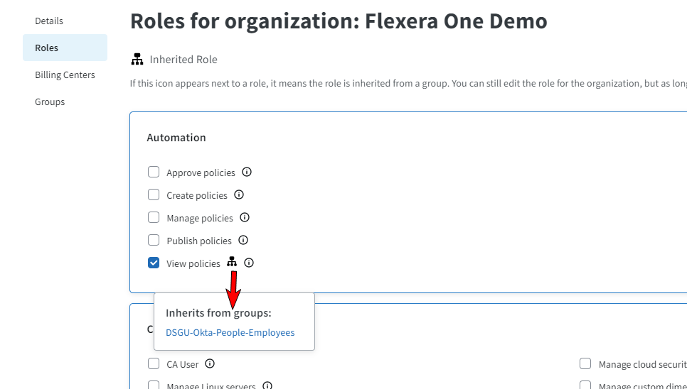 - As long as the user is a part of an account or group with this role they will have the inherited permissions. You can click the Inherited Role icon to view the group name from where the role is inherited.