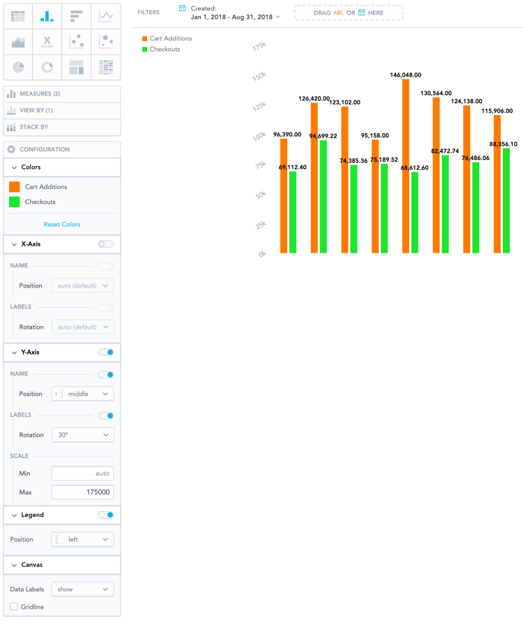 Data Explorer allows you to change the default properties of your insights. You can show or hide axes, disable gridlines, rotate labels, change colors, and so on.