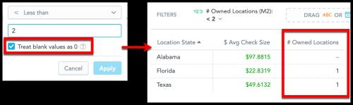 In the following example, the insight displays Average Check Size and the number of Owned Locations in different states and is filtered to display only the states with fewer than two owned locations.