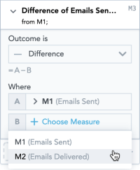 Data Explorer creates an automatic name for calculated measures. The name consists of the name of the function and measures used. For example, Difference of Emails Sent and Emails Delivered. For details about changing the name, see Renaming Measures.