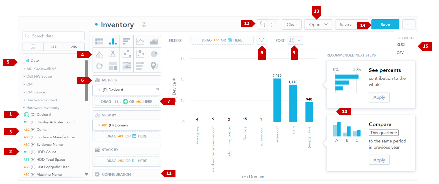 The numerical callouts in the screenshot correspond to the following description to help you understand what you can do in Data Explorer . You can: