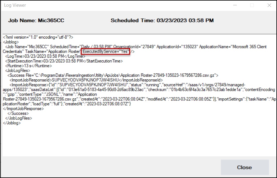| View | Click the View link to open the Log Viewer , which displays the Job Log information for the scheduled job run. See the following sample screenshot. If you selected the Advanced installation option in Installing FSM Data Ingestion Utility to run FSM Data Ingestion Utility as a Windows Service, the Job Log information displays the XML attribute ExecutedbyService=“Yes” next to the TaskName. For details, see the red box in the following screenshot. |